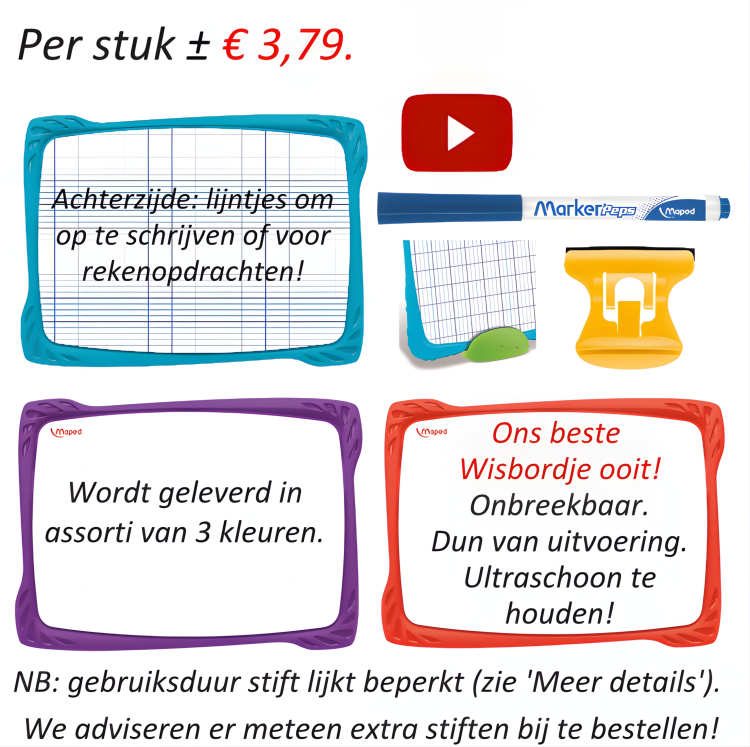 Ons beste Wisbordje. In assorti kleuren en met houder om deze horizontaal op de tafel te kunnen zetten + blauwschrijvende stift + Wisser op de houder. Onbreekbaar. Worden geleverd in de kleuren blauw, rood en paars.