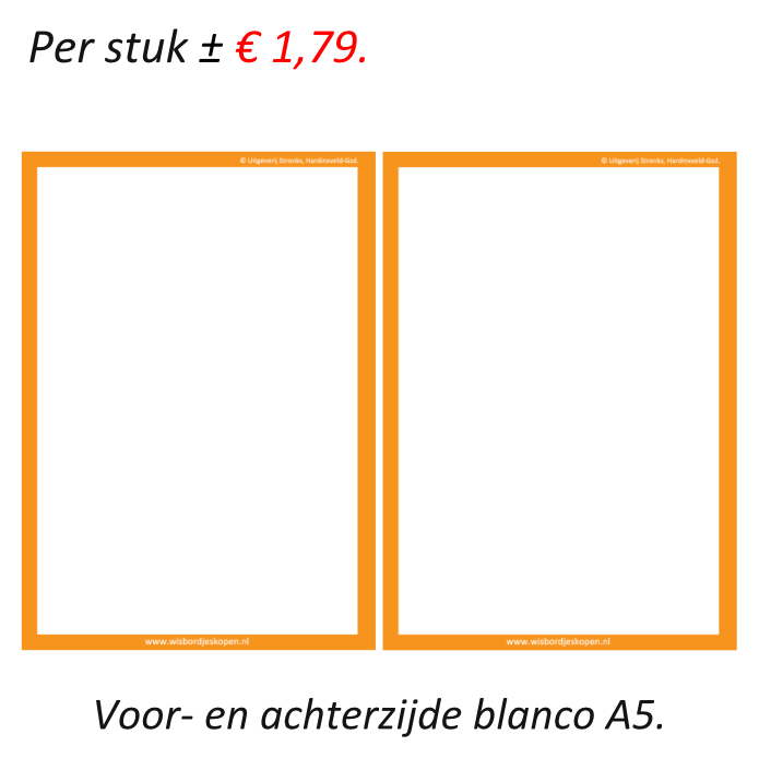 Op 300 grams dun karton geprinte dubbelzijdige invulbladen, glanzend gelamineerd met stevige 125 micron lamineerhoezen. Compact A5-formaat. Voorzijde: blanco. Achterzijde: blanco.